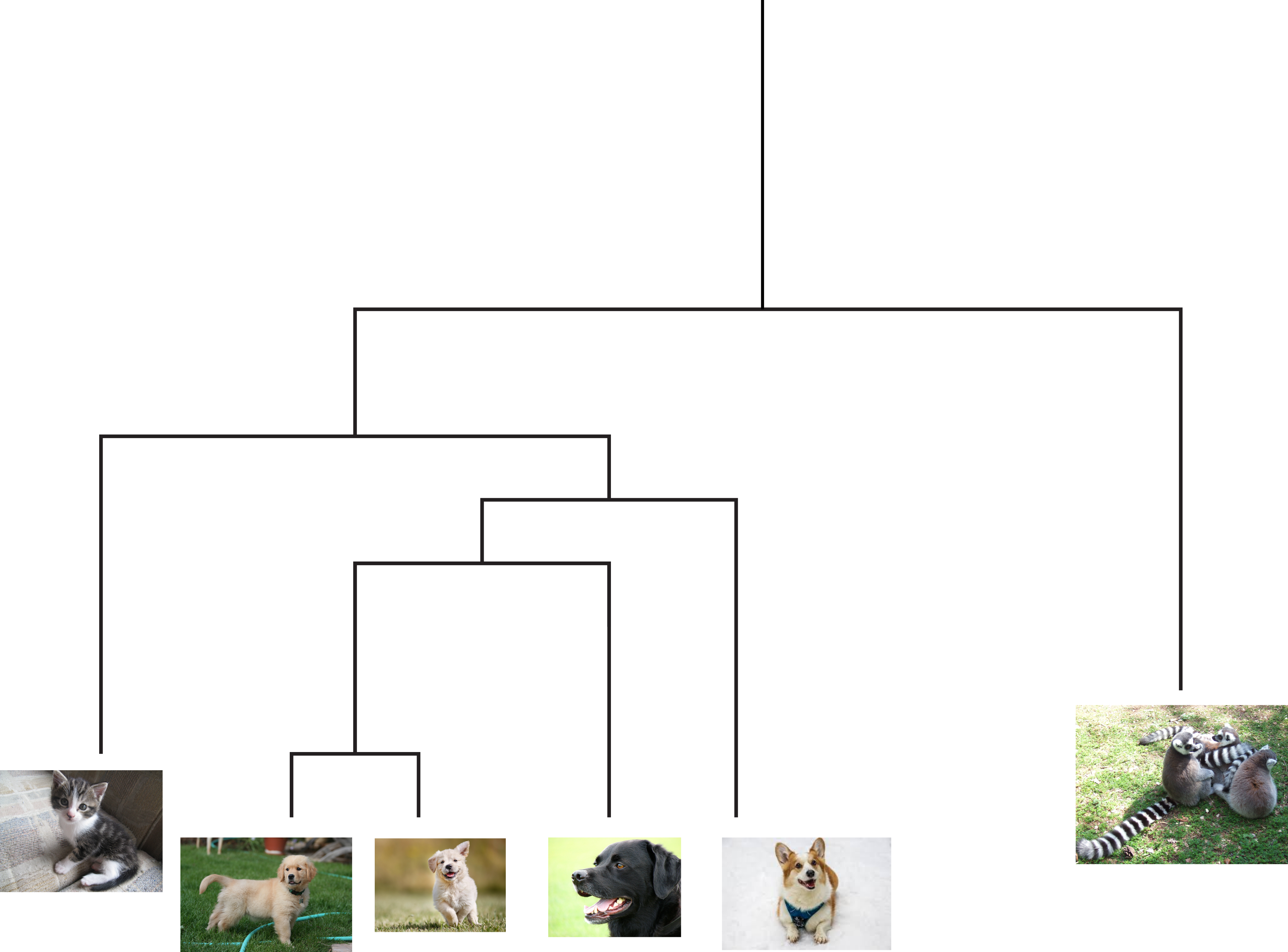 Connectivity based clustering is also known as hierarchical clustering. One of the core ideas is that things can be grouped together at different levels. For example a picture of a golden retriever could be grouped with other retriever breeds, all dogs, common pets, all animals, etc. In this case other pictures of retrievers would be close, other dogs slightly further away, and then other animals further away from that. This creates a dendrogram (tree) and the clusters are determined by where you cut in the tree. For example in the figure if you cut at the first branch, you would have two clusters: one containing lemurs, and the other containing all of the pictures of cats/dogs. Cutting at the next branch down you would have three clusters: lemurs, cats, and all dogs.