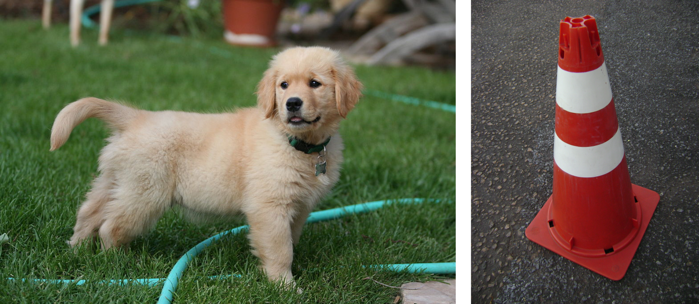 To make this more concrete let’s use an (admittedly ridiculous) example. Let’s say we have a bunch of pictures, and we want to classify whether the image is of a dog or a traffic cone. This seems pretty simple on the surface because a traffic cone looks nothing like a dog.