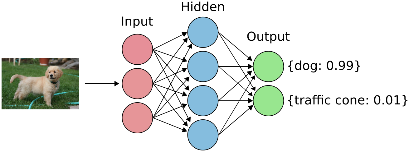 At a very high level, the input layer derives features from the data that you pass into it. The arrows connecting the layers are referred to as weights. The first hidden layer then receives the features from the input layer, multiplied by the weights between the two layers. If there are multiple hidden layers, then the first layer acts as an input layer for the second layer and so on. Finally, it goes to the output layer where the neural network makes predictions about the input data (e.g. is it a dog or a traffic cone). There is one neuron in the output layer for each class we are trying to predict. We can compare these predictions to their actual labels (e.g. the model predicted the image was a traffic cone but it was actually a dog). Each prediction also has a probability associated with it (e.g. “I am 99% sure this is a dog”). How you actually compare the predicted and actual labels is known as the objective function (sometimes referred to as a cost or loss function). We can use this objective function to update the weights in our model (using something called backpropagation). We repeat this process over and over again until we are satisfied with the model performance. This process is known as “training” a model.