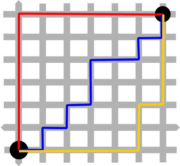 Look at the two people outside the billiards room. If you were playing the game and wanted to move one to the other, you could not move them on a straight line between them. You’d have to move 1 over and then 3 up/down for a total of 4 moves. This is similar to Manhattan (also known as city block) distance, which is the sum of the distances in each direction. In the illustration below, the Manhattan distance between the two points is 12. If you were walking you would need to walk 12 city blocks (assuming you can’t walk through buildings), but there are multiple routes you could take. Manhattan distance is useful for higher dimensional data where Euclidean distance breaks down in what is known as “the curse of dimensionality”.