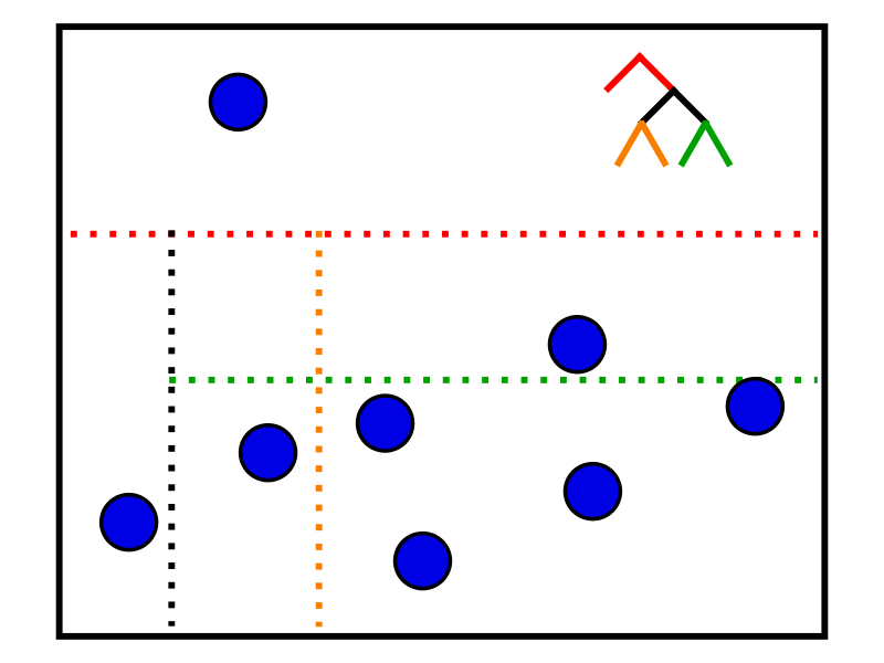 In this case, the first cut is shown in red. Everything above it is in one partition (which in this case is an isolated point), while everything below it is in another. We can make a cut to the bottom partition (shown in black) and isolate another point. We can keep cutting and build up the tree. At the end, every leaf node will correspond to an isolated point. The hypothesis is that anomalies will be closer to the root node than “normal” points. The algorithm works as follows: