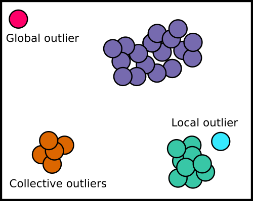 - Collective outliers : These are groups of outlying points which may have some underlying pattern. This would be like having a spam campaign of emails where they look strange compared to normal email, but are all related to one another.