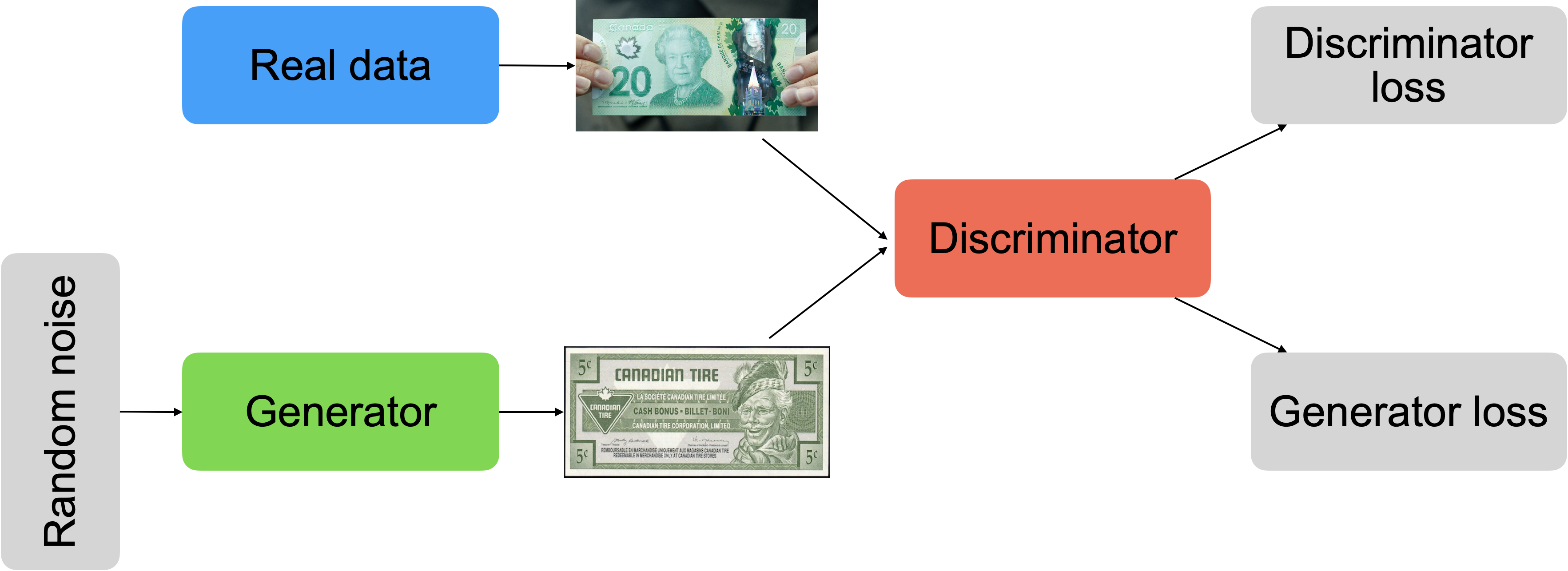 GANs are a technique created by Ian Goodfellow which involves two [neural networks]../2020-04-08-d-is-for-deep-learning/index.qmd pitted against one another. One neural network (called the generator/creator) tries to create realistic looking data (typically starting from random noise). The other network (the discriminator/investigator) is fed a combination of fake and real data and it tries to predict whether the data is real or fake. This is a zero-sum game, so any gains made by the generator are lost by the discriminator. As training goes on, both models will get better at their tasks and the generated data will be more realistic. To steal an analogy from this great episode of Linear Digressions it’s like one person is trying to counterfeit money and the other person needs to determine counterfeit from the real money. Below is a high level view of the architecture of a GAN. Initially the generated data is pretty clearly fake